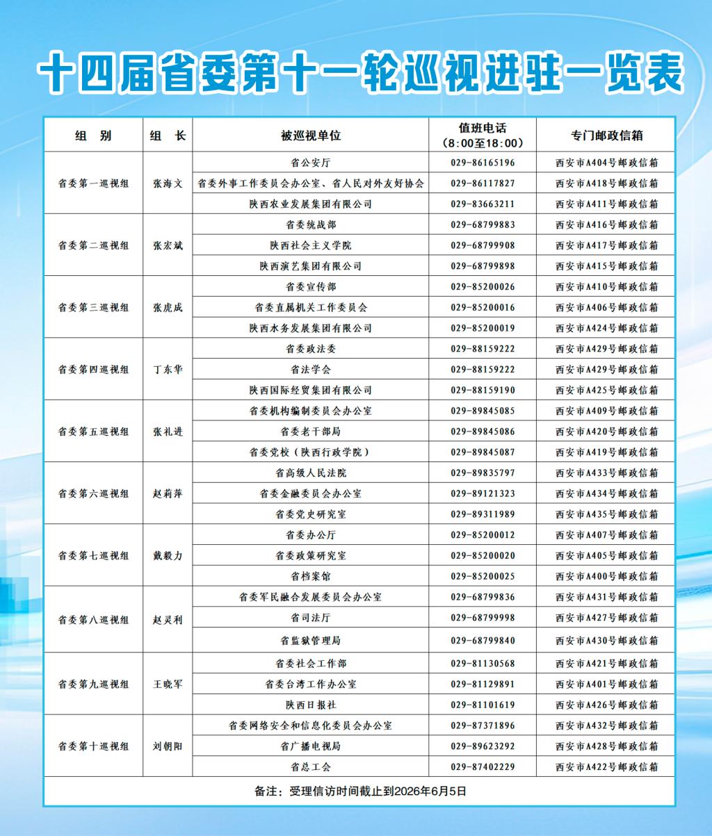 据悉,省委巡视组将在被巡视单位工作50天左右,巡视期间设立专门值班电话和邮政信箱,主要受理反映被巡视党组织领导班子及其成员、下一级党组织主要负责人问题的来信来电,重点是关于违反政治纪律、组织纪律、廉洁纪律、群众纪律、工作纪律、生活纪律等方面的举报和反映。巡视组受理信访时间截止到2026年6月5日。